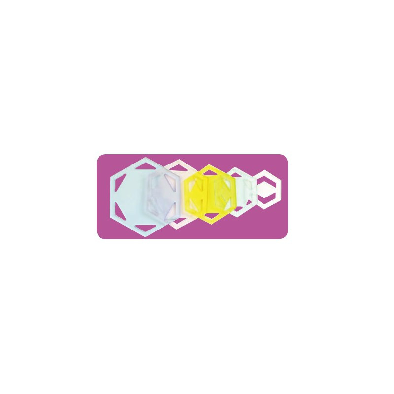 Set de 5 plantillas con forma de hexágonos para patchwork. Fabricado en metacrilato. Tienen un diámetro de 1.5″ (3,8 cm), 2″ (5 cm), 2.5″ (6,35 cm), 3″ (7,6 cm) y 3.5″ (8,9 cm). Tienen un margen de costura de 1/4″.